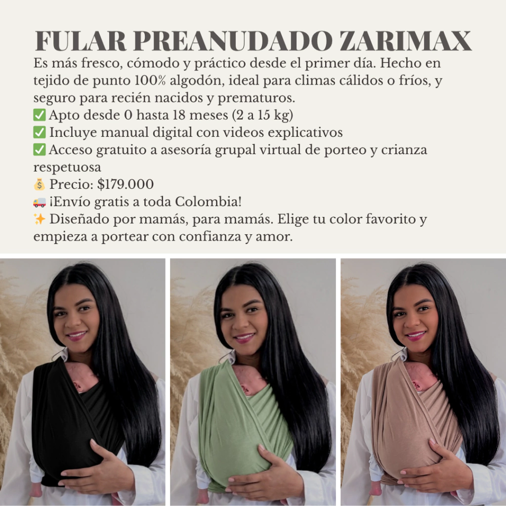 El Fular Preanudado Ergonómico ZariMax te acompaña desde el primer día, incluso si tu bebé llegó antes de tiempo hasta los 18 meses.